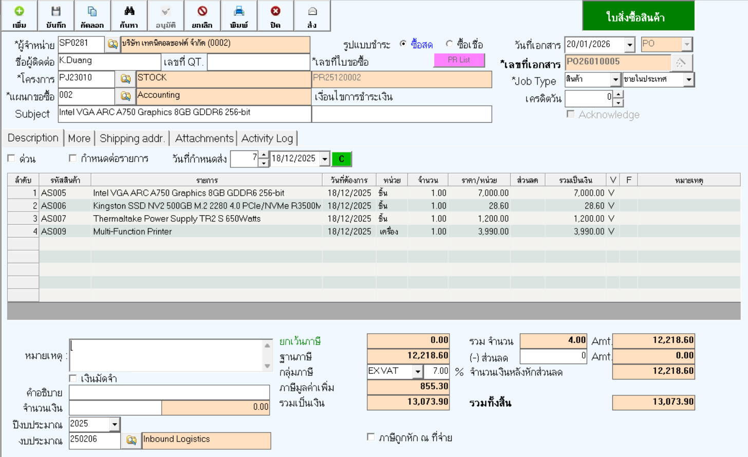 3. ในการออกใบสั่งซื้อสามารถออกได้ 2 แบบคือ อ้างอิง ใบขอซื้อ กับเปิดโดยไม่อ้างอิงใบขอซื้อ (แล้วแต่นโยบายบริษัทฯ)