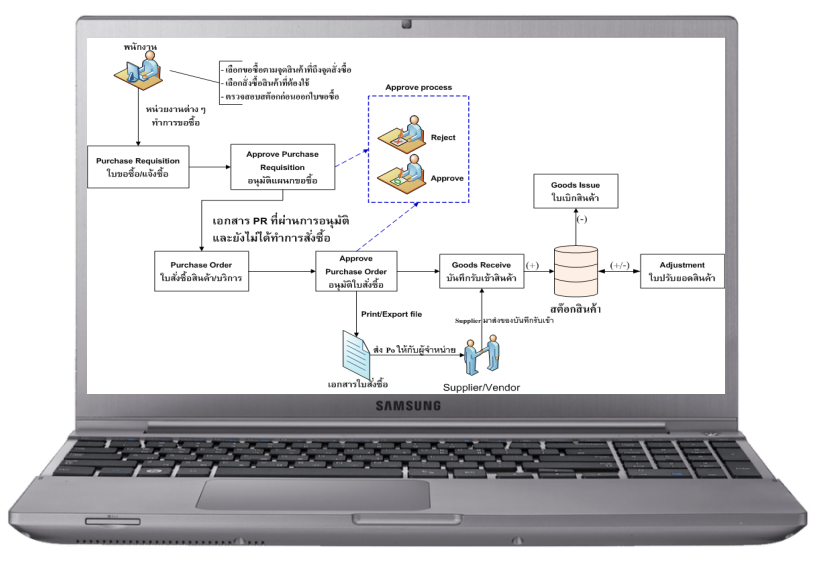 โปรแกรมระบบจัดซื้อ เป็นโปรแกรมที่ช่วยอำนวยความสะดวกในการทำงานของแผนกจัดซื้อและแผนกที่เกี่ยวข้อง โปรแกรมเปี่ยมด้วยประสิทธิภาพและประสิทธิผล เพิ่มศักยภาพในการทำงาน ลดขั้นตอนการทำงานที่ยุ่งยาก ลดการทำงานที่ซ้ำซ้อน สามารถตรวจสอบทางเดินเอกสาร รวมถึงการเรียกดูรายงานย้อนหลัง สถานะและประวัติของเอกสารได้ และสามารถจัดสั่งพิมพ์แบบฟอร์มเพื่อเป็นหลักฐานได้ทุกขั้นตอน การบันทึกข้อมูลแบบ Real Time โดยมีขั้นตอนการทำงาน ดังนี้